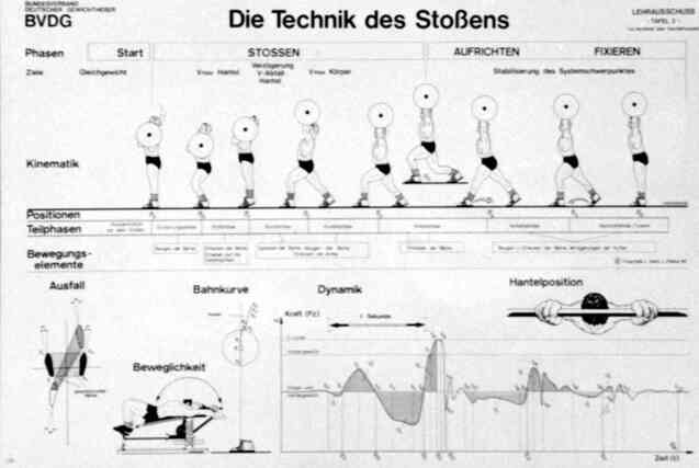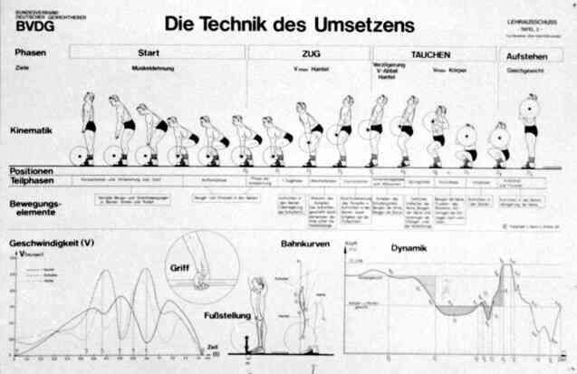 2. Beim Umsetzen wird die Hantel in Brust- bis Schulterhöhe gebracht (umgesetzt); das geschieht auf ähnliche Weise wie beim Reißen aus der Hocke heraus oder durch einen Ausfallschritt. Wenn dann der Gewichtheber aufgerichtet festen Stand gewonnen hat und die Hantel sicher auf seinen nach unten abgewinkelten Armen ruht, berginnt das