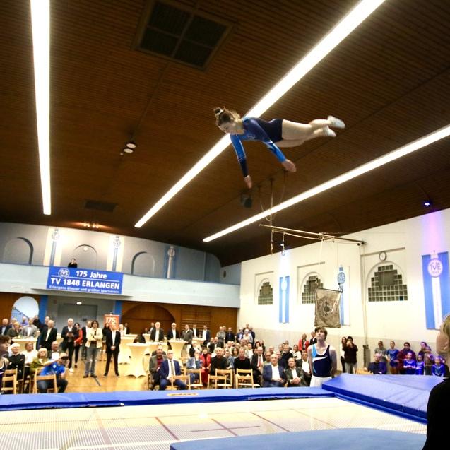 Getreu dem Motto „Dem Sport verbunden“ zeigte sich schon bei der Begrüßung durch Moderator Ulf Thaler, welche Verbindungen der Turnverein innerhalb der Stadt Erlangen und über die Stadtgrenzen hinaus hat. Welche Vielfalt der Turnverein bietet, wurde beim Einmarsch der Sportarten deutlich. Über 40 Sportlerinnen und Sportler zogen gemeinsam in die altehrwürdige Jahnhalle ein und reihten sich vor den Gästen auf und symbolisierten die sportliche Bandbreite des Vereins.