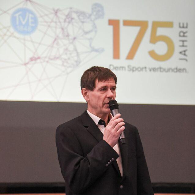 Der 1. Vorsitzende Jörg Bergner begrüßte die zahlreich erschienenen Gäste und hob in seinem Grußwort insbesondere die Herausforderungen während der Coronajahre und die aktuelle Energiekrise mit der damit verbunden allgemeinen Teuerung hervor. Er sieht den Turnverein dank der Unterstützung von Stadt und Staat dennoch gut gerüstet für die künftigen schwierigen Aufgaben: „Arbeit, die erledigt ist, lacht.“ Passender kann man die Situation beim TV 1848 nach den großen Anstrengungen bei den energetischen Sanierungen in den letzten Jahren im Hinblick auf die aktuelle Energiepreisentwicklung nicht beschreiben. Mit Freude gab er dem Publikum zudem einen Einblick in die Planung der Feierlichkeiten im Jubiläumsjahr und übergab schließlich das Wort an Jörg Ammon.