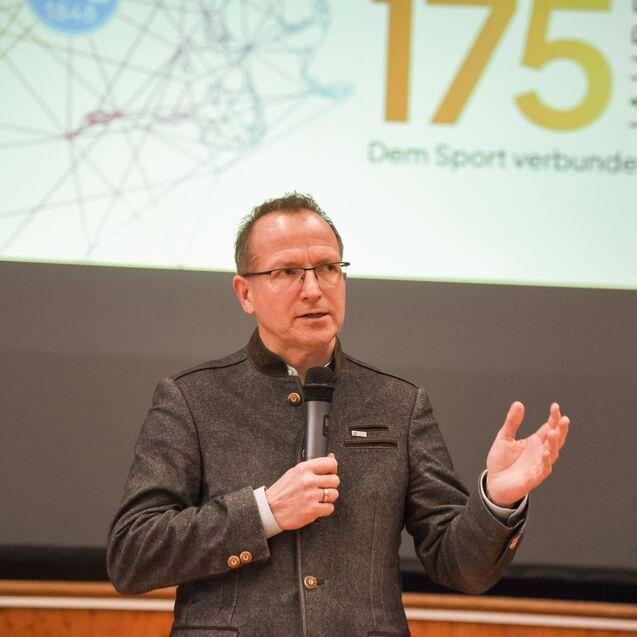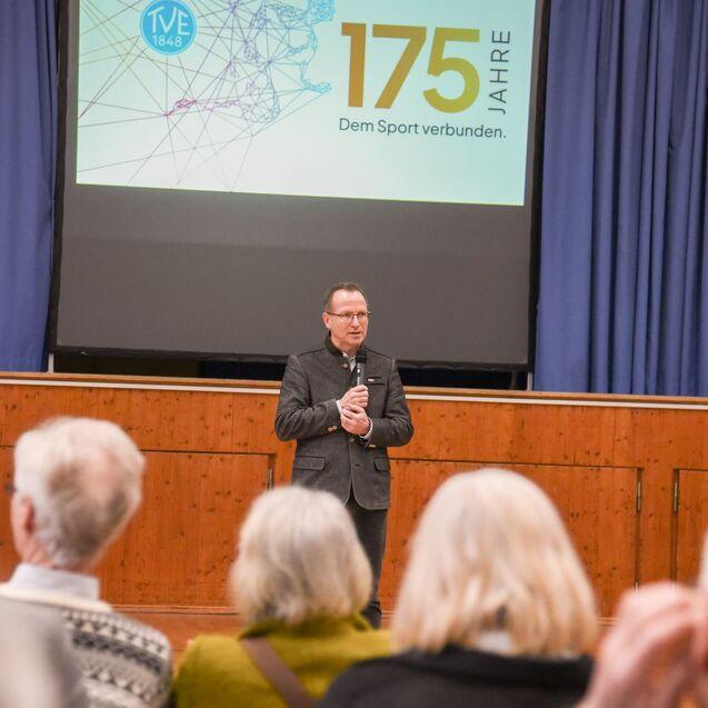 Der BLSV‑Präsident konnte in seiner Grußrede die finanzielle Unterstützung durch den Freistaat Bayern mit der erneut verdoppelten Vereinspauschale untermauern und lobte die Stadt Erlangen für ihre vorbildliche Unterstützung der lokalen Vereine. Andere Städte dürften sich hieran gerne orientieren, so Ammon. Er betonte das Engagement des TV 1848 in Sachen Klimaschutz – hier gilt der Verein als ein Vorreiter in Bayern. Abschließend gratulierte er dem TV 48 als einem der ältesten bayerischen Sportvereine zum 175‑jährigen Geburtstag.