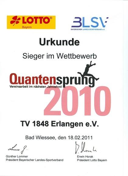 Der TV 1848 erhält als einer von 5 Vereinen in Bayern den "Quantensprung 2010" von BLSV und Lotto Bayern für zukunftsfähige Vereinsprojekte.