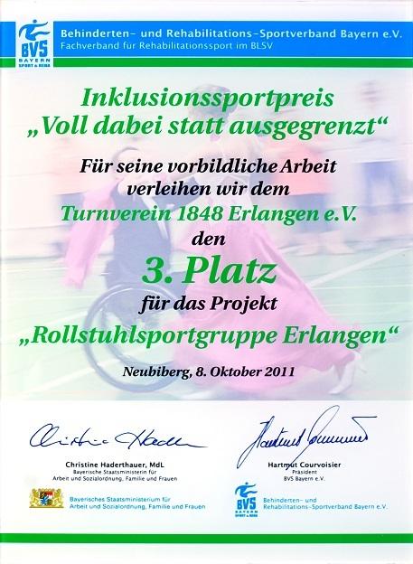 Der TV 1848 erhält für die Rollsportgruppe den 3. Preis des Behinderten- und Rehabilitations-Sportverbandes Bayern im Wettbewerb um den Inklusionssportpreis 2011.