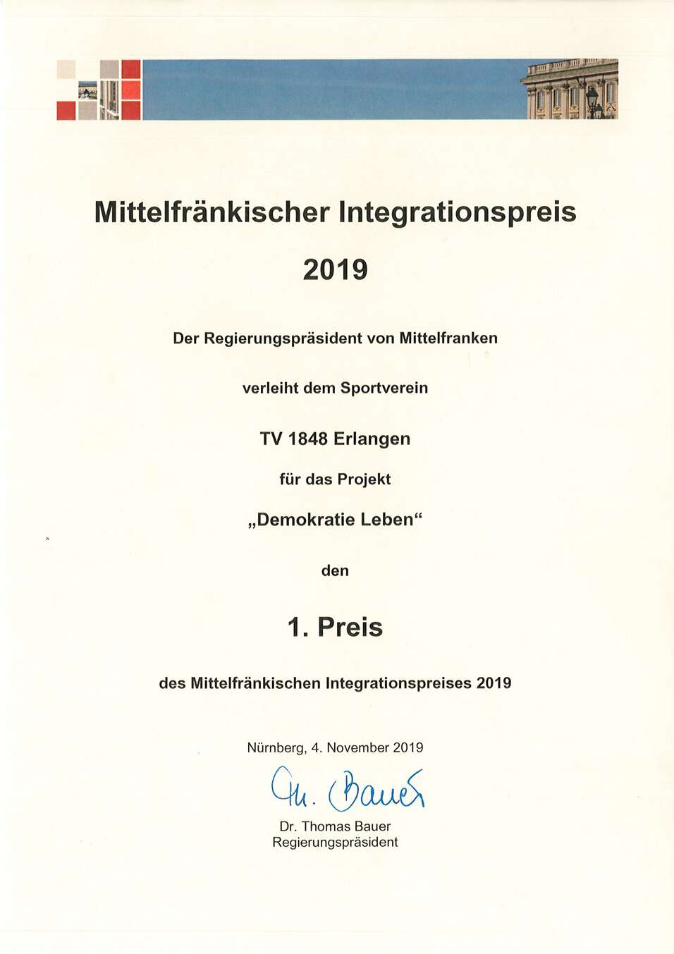 Der Turnverein 1848 Erlangen welcher das Projekt zusammen mit Mark Sauerborn (Ressort Integration durch Sport, BLSV), der Mönauschule sowie dem Verein „Gesundheit und Medizin“ durchführt, wurde dafür mit dem 1. Platz beim Integrationspreis der Regierung Mittelfranken ausgezeichnet.