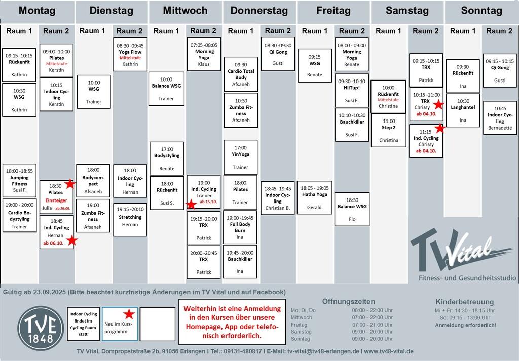 | Infos Sportart:TV-Vital Abteilung:TV-Vital Altersklasse:Jugendliche und Erwachsene Geschlecht:(m/w) Ort TV-Vital Dompropstraße 2b 91056 Erlangen Deutschland Kursraum 2 Übungsleitung Chrissy | |||