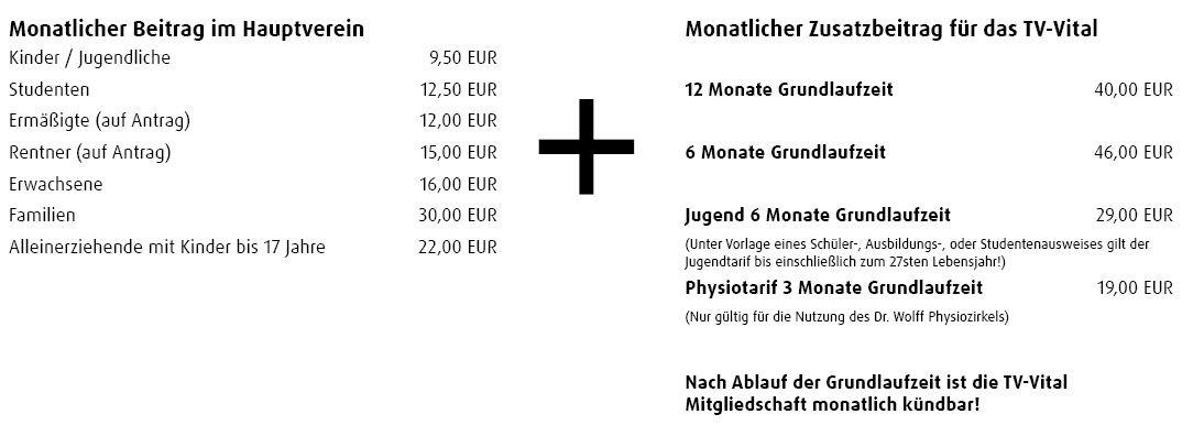Der Beitrag im TV-Vital setzt sich zusammen aus dem Beitrag für den TV 1848 („Hauptverein“) und einem Zusatzbeitrag für die Nutzung des Fitness- und Gesundheitsstudio TV-Vital. Als Mitglied im TV-Vital können Sie also alle Angebote des TV 1848 ebenfalls nutzen!