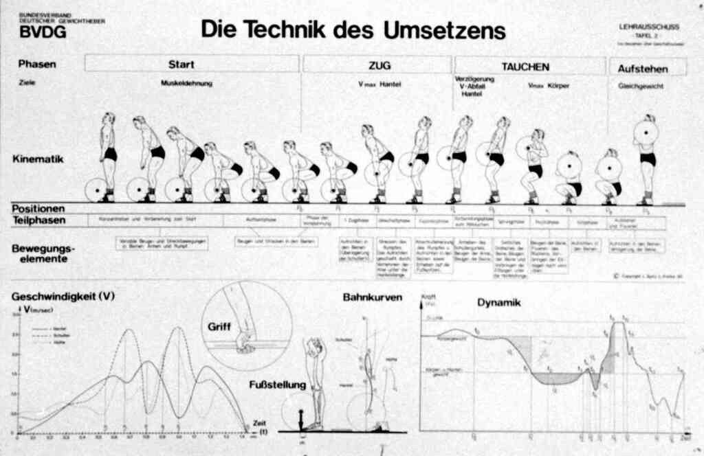 2. Beim Umsetzen wird die Hantel in Brust- bis Schulterhöhe gebracht (umgesetzt); das geschieht auf ähnliche Weise wie beim Reißen aus der Hocke heraus oder durch einen Ausfallschritt. Wenn dann der Gewichtheber aufgerichtet festen Stand gewonnen hat und die Hantel sicher auf seinen nach unten abgewinkelten Armen ruht, berginnt das