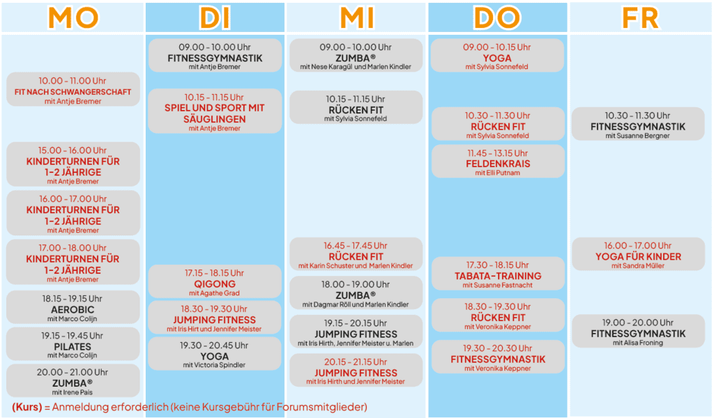 Das Gymnastikforum bietet Ihnen Sportangebote aus den Bereichen Fitness, Gesundheit und Entspannung. Diese Angebote finden im Gymnastikraum am Kosbacher Weg statt. Hochwertige Räumlichkeiten, ein umfangreiches Sportangebot und qualifizierte Übungsleiter erwarten Sie im „Gymnastikforum Alterlangen“.