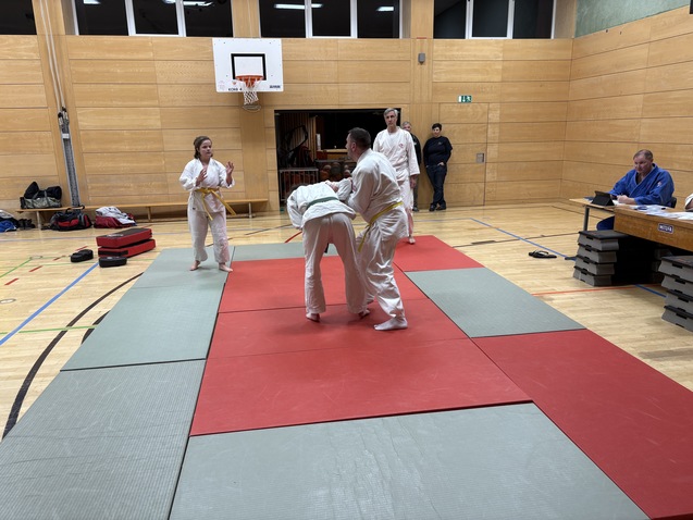 Robert beeindruckte für den gelben Gürtel (5. Kyu) mit präzisen Grundtechniken in den Bereichen Schlagen, Treten, Werfen und Hebeln. Zusätzlich demonstrierte er das Selbstverteidigungssystem „fence“ mit großem Geschick. Julia und Artur präsentierten für den orangefarbenen Gürtel (4. Kyu) eine saubere Fallschule und meisterten souverän erste Selbstverteidigungsszenarien.