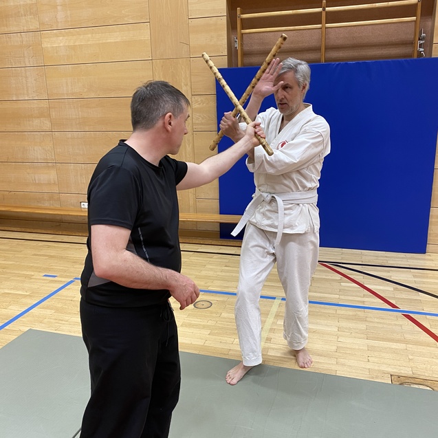 Neben verschieden Schlag- und Tritttechniken trainieren wir eine Vielfalt von Würfen, Hebeln und Waffentechniken sowie Bodenkampf.