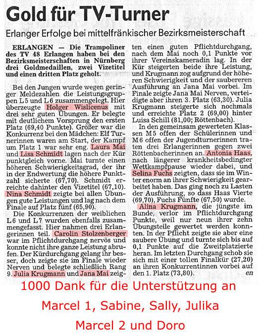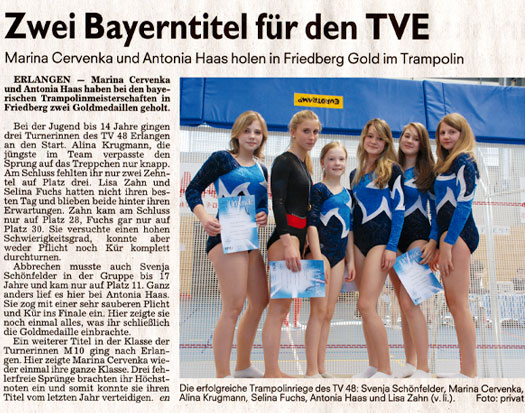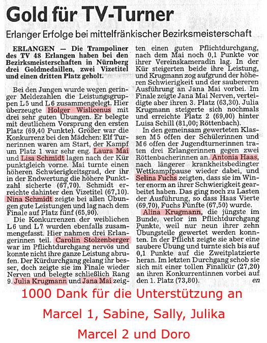 Bayerische Meisterschaften verliefen fanthaastisch. Demnächst gibt es hier natürlich noch einen längerer Bericht und auch Bilder vom Wettkampf aber vorab muss ich euch natürlich mitteilen, dass unsere Abteilung 2 frischgebackene bayerische Meister hat. Marina Cervenka, die wieder einmal zeigte, was sie auf dem Tuch kann. 3 fehlerlose Durchgänge bescherten ihr mit einem Abstand von fast 8 Punkten den ersten Platz.