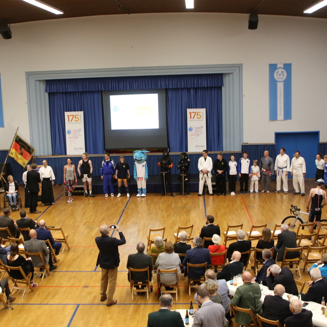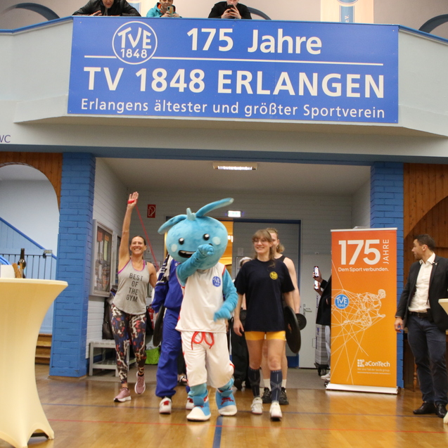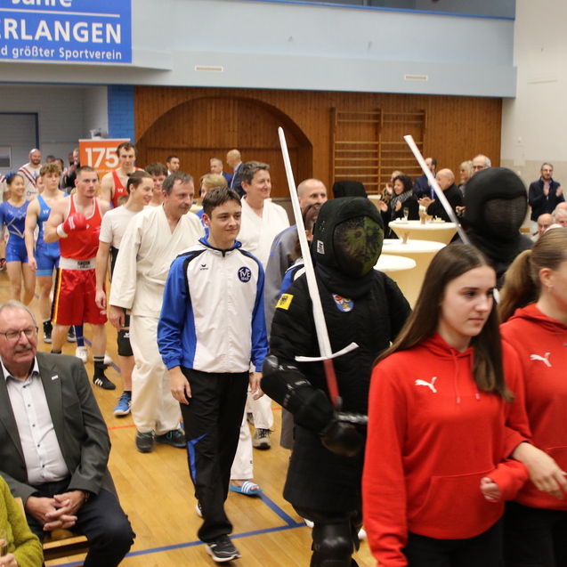 Getreu dem Motto „Dem Sport verbunden“ zeigte sich schon bei der Begrüßung durch Moderator Ulf Thaler, welche Verbindungen der Turnverein innerhalb der Stadt Erlangen und über die Stadtgrenzen hinaus hat. Welche Vielfalt der Turnverein bietet, wurde beim Einmarsch der Sportarten deutlich. Über 40 Sportlerinnen und Sportler zogen gemeinsam in die altehrwürdige Jahnhalle ein und reihten sich vor den Gästen auf und symbolisierten die sportliche Bandbreite des Vereins.