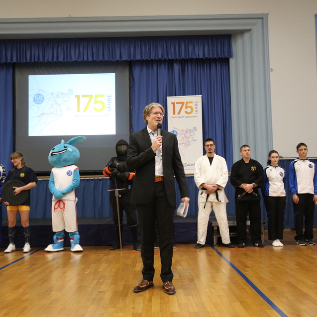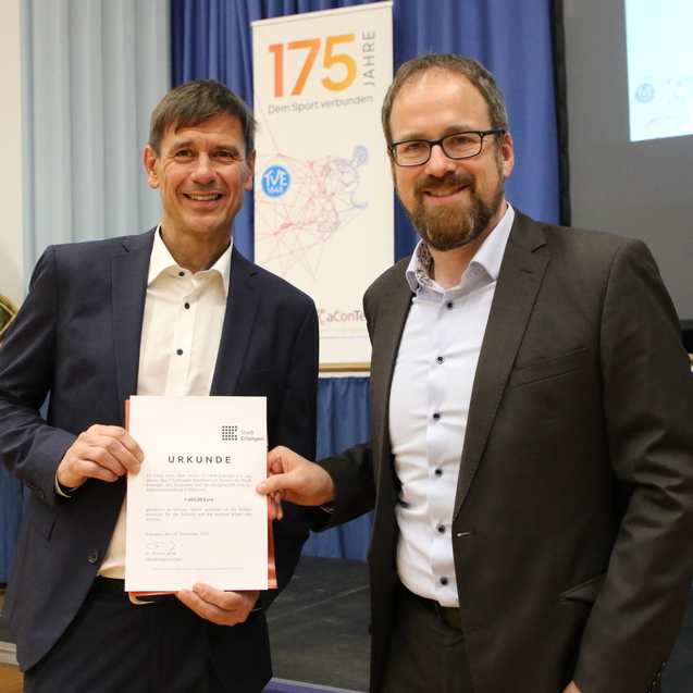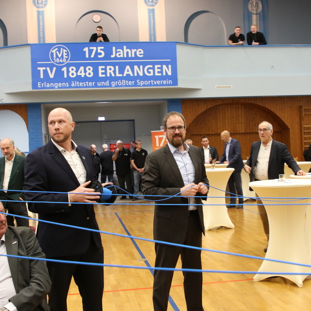 Im lockeren Dialog mit Ulf Thaler zeigte Oberbürgermeister Dr. Janik, welchen Stellenwert der Verein für die Stadt Erlangen aber auch für ihn als Privatperson hat. So „verführt“ der TV ihn immer wieder zu sportlichen (Höchst-)Leistungen. Sei es bei der Triathlon-Staffel oder beim bevorstehenden Indoor-Cycling-Marathon. Der Turnverein ist nicht auf sich selbst fokussiert, so Janik. Als wichtiger Partner der Stadt springt der Verein immer wieder ein – als Beispiel nannte der OB die Organisation des Erlanger Schülertriathlons, welchen es wohl ohne den TV nicht mehr geben würde. Rückblickend auf das Jubiläumsjahr des Vereins bleiben tolle Erinnerungen und sportliche Highlights. Den Zieleinlauf im Schlossgarten beim Erlanger Triathlon wird es wohl auch 2024 wieder geben – der Sportausschuss hat die notwendigen Finanzmittel bereits beschlossen. Ob auch das Sparkassen Box Battle in der Jahnhalle eine Wiederauflage bekommt, wird sich zeigen. Wünschen würde er es sich, so der Oberbürgermeister und bekommt direkt wieder Gänsehaut beim Gedanken daran.