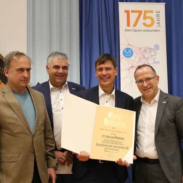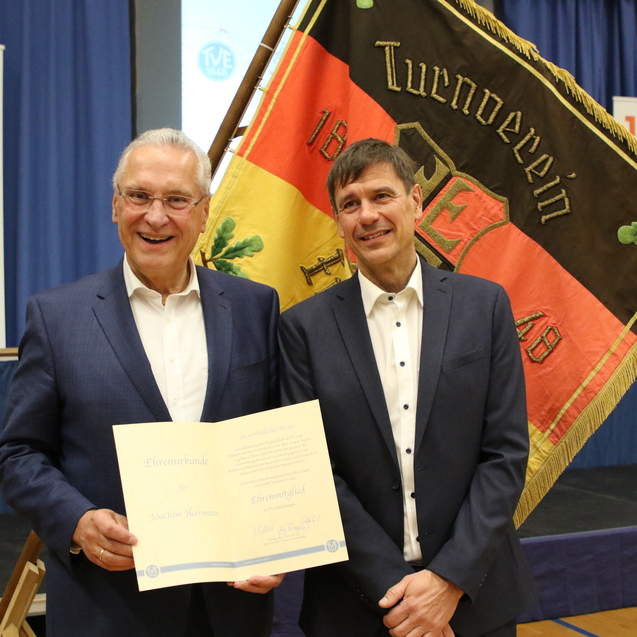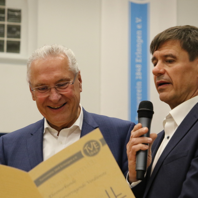 Sichtlich überrascht war Innenminister Joachim Herrmann als die Vereinsführung ihn zum Ehrenmitglied für hervorragende Verdienste um den Sport in Bayern ernannte. Herrmann ist seit 1989 Mitglied im Turnverein. In seiner Laudatio stellte Jörg Bergner heraus, welche Rolle Herrmann in seiner Funktion als Innenminister für den Sport hat. Durch die Verankerung des Sports im Innenministerium hat sich die Unterstützung und die Wertschätzung der Vereine in Bayern immens verbessert. Der Sport hat einen großen Stellenwert in Bayern und das ist auch und insbesondere Joachim Herrmann zu verdanken. In besonderer Anerkennung und mit großem Dank ernannte daher der Vorstand den Innenminister zum Ehrenmitglied des TV 1848 Erlangen.